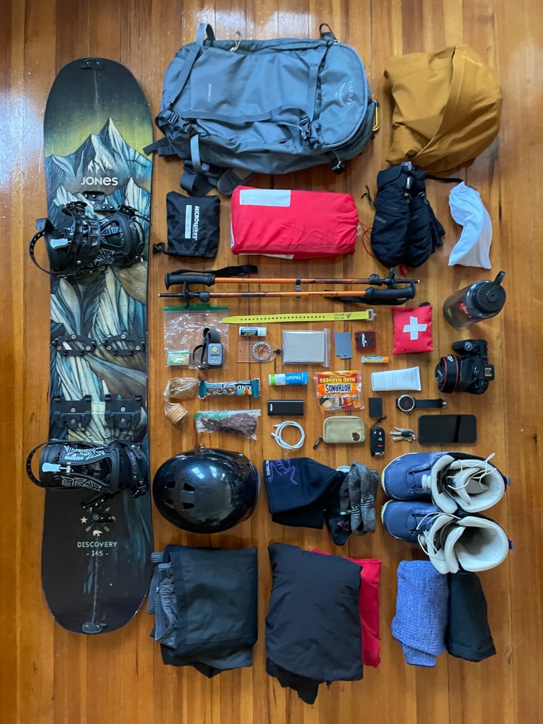 Packing for a backcountry snowboard trip is three parts: hiking (backpack, first aid, layers, compass, headlamp, snacks, water, micro spikes), snowboarding (board, boots, helmet, shell, snow pants, goggles, mittens, hand warmers), and splitboarding gear (poles, straps, skins, tools). It can be a lot of gear. I usually pack more emergency stuff than needed.